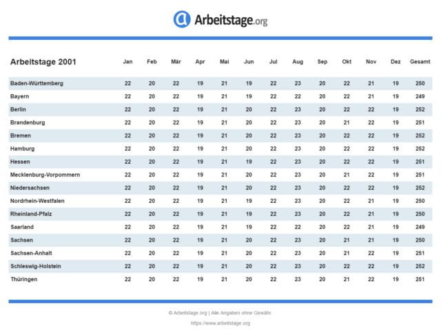 Erfahren Sie, wie viele Arbeitstage das Jahr 2001 hat. Die Anzahl der Arbeitstage variieren je nach Bundesland unter Berücksichtigung der gesetzlichen Feiertage 2001, Wochenenden und regionalen Feiertage.